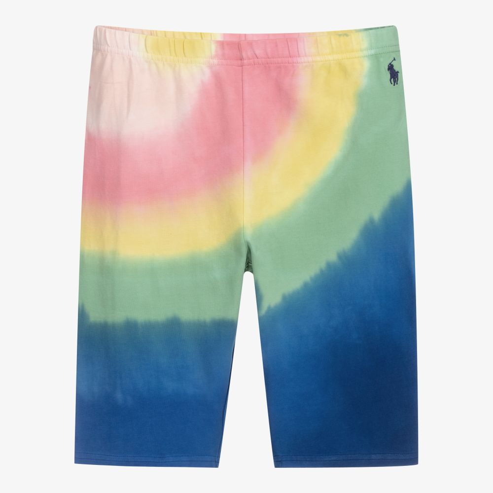 Teen girls cotton cycling shorts by Polo Ralph Lauren, with a colourful print that follows the modernised tie-dye trend. Soft and stretchy, they have the brand's navy blue Signature pony logo embroidered under the elasticated waistband.