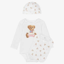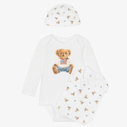 This white babysuit set for boys by Ralph Lauren, is made in soft cotton jersey. The bodyvest features a large iconic Polo Bear on the front and has a useful envelope neck and popper fastenings between the legs. The bib and hat feature an all over navy blue Polo Bear and logo pattern. The bib fastens with a popper on the back and the double layer hat has a cute turned up brim.