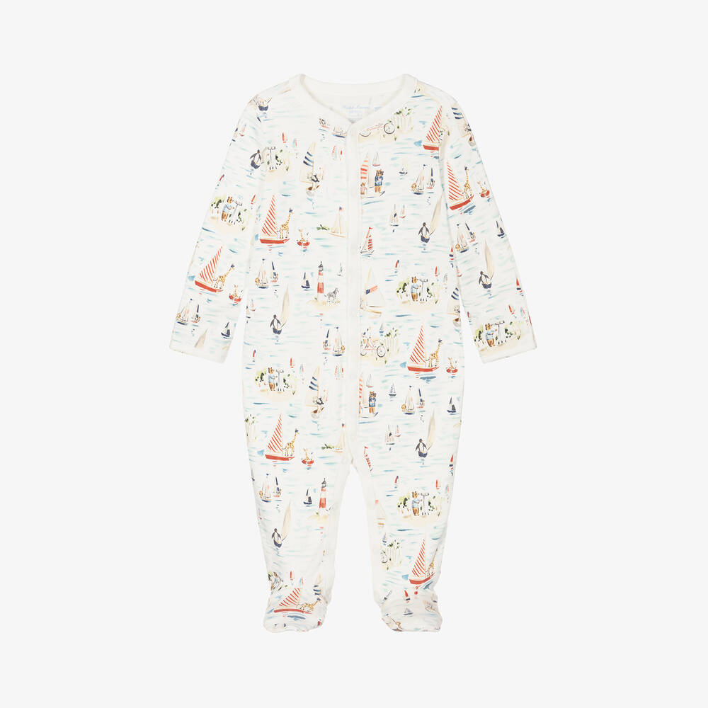 A white babygrow for boys and girls by Ralph Lauren, made in soft cotton jersey with enclosed feet. Illustrated by Riley Sheehey, this sweet babysuit is printed with a nautical sailboat and lighthouse design with friendly animals and blue watercolour waves. It has convenient popper fastenings to make dressing easy and long sleeves with protective fold-over scratch mitts.