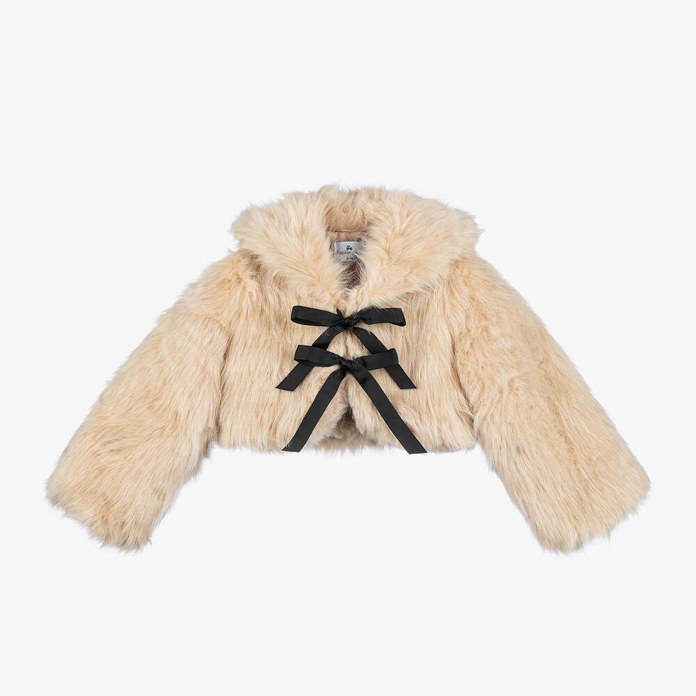 A gorgeous beige jacket for girls by RaspberryPlum, made from fluffy faux fur for a beautifully soft feel. In a stylish, cropped design, this lovely jacket has a silky, lightweight lining, oversized sleeves and a smart collar. It secures with hooks on the front, neatly concealed beneath black grosgrain ribbons that tie into pretty bows.
