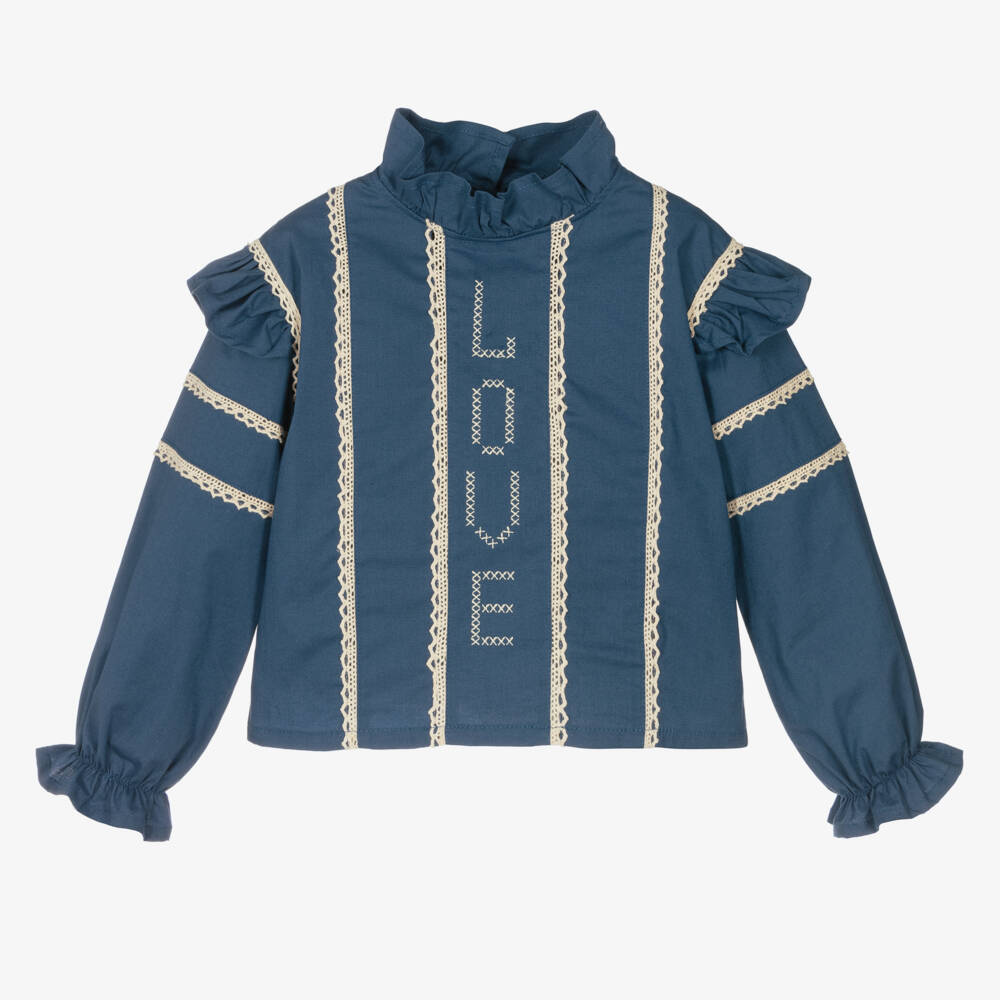By London-based designer RaspberryPlum, a gorgeous mid-blue blouse for girls with a touch of ivory cotton lace. With a 60's-inspired cross-stitched 'LOVE' motif on the front, it has a Victorian style high-neck, and accentuated puffed sleeves.