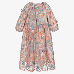 Ideal for a special occasion, this beautiful blue dress for girls by RaspberryPlum showcases contemporary elegance with its delicate floral embroidery in pink, blue and green. Made in sheer tulle with a comfortable cotton lining, the romantic puffed sleeves have a cape-effect shoulder detail that fastens in a bow on the front. The contemporary, floor-length silhouette is complete with a full, gathered skirt and a concealed zip fastening on the back.