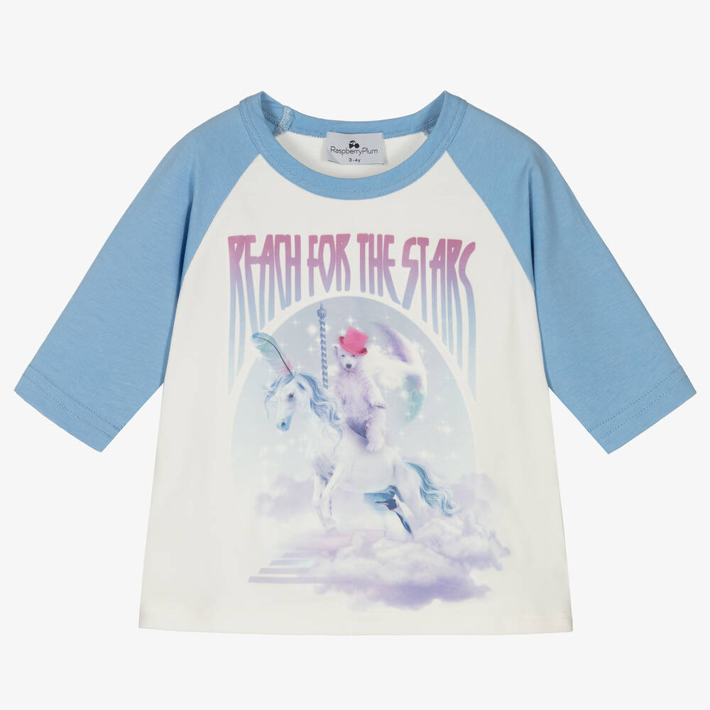 Ivory T-shirt for girls by RaspberryPlum, with pale blue, cropped raglan sleeves for a retro look. Made from a soft and stretchy jersey, this easy-to-wear cotton crew neck has an eccentric unicorn and polar bear print on the front. A 'Reach for the Stars' slogan can be found on the chest in pastel hues of blue and purple.