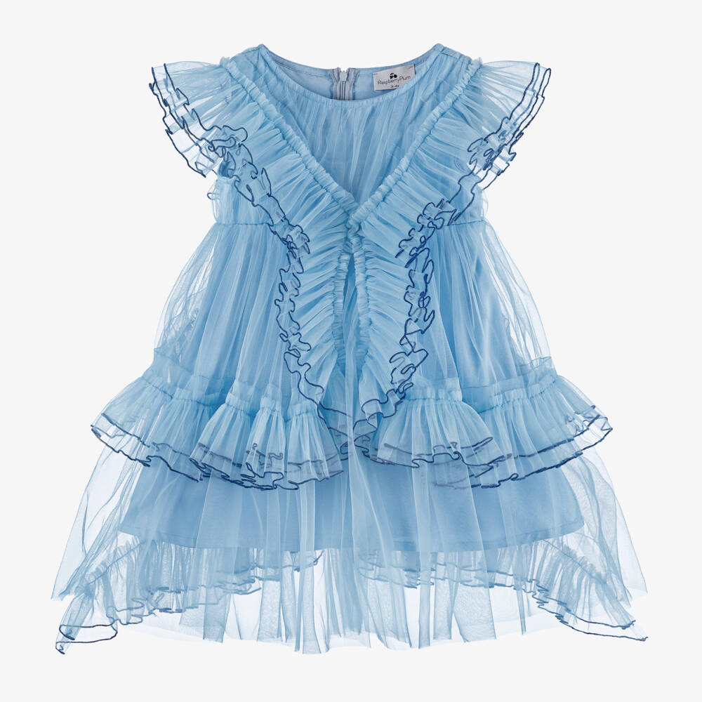 For girls who love to twirl, a gorgeous blue dress in soft tulle by RaspberryPlum. The sleeveless design is trimmed with eye-catching ruffles, edged in a darker contrasting blue for stand-out style. Ideal for a party or special occasion, this statement dress has a soft viscose lining for comfort and a concealed zip fastening on the back.