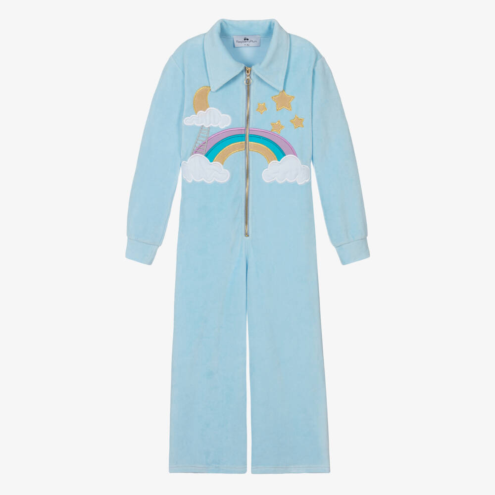 Stand out in style in this super soft, pale blue jumpsuit for girls by RaspberryPlum. Made in comfortable and stretchy velour, it has an eye-catching rainbow, clouds and stars appliqué on the front. This retro-looking piece has slightly flared legs, a pointed collar and chunky gold zip fastening on the front.