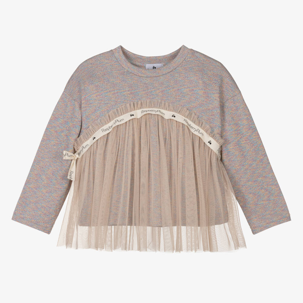 Grey marl top for girls by RaspberryPlum, made in a soft cotton blend with a glittery yellow, blue and pink lurex weave. Fun and quirky, this casual jersey top has a beige tulle trim on the front and back with a branded trim for a contrast in texture.