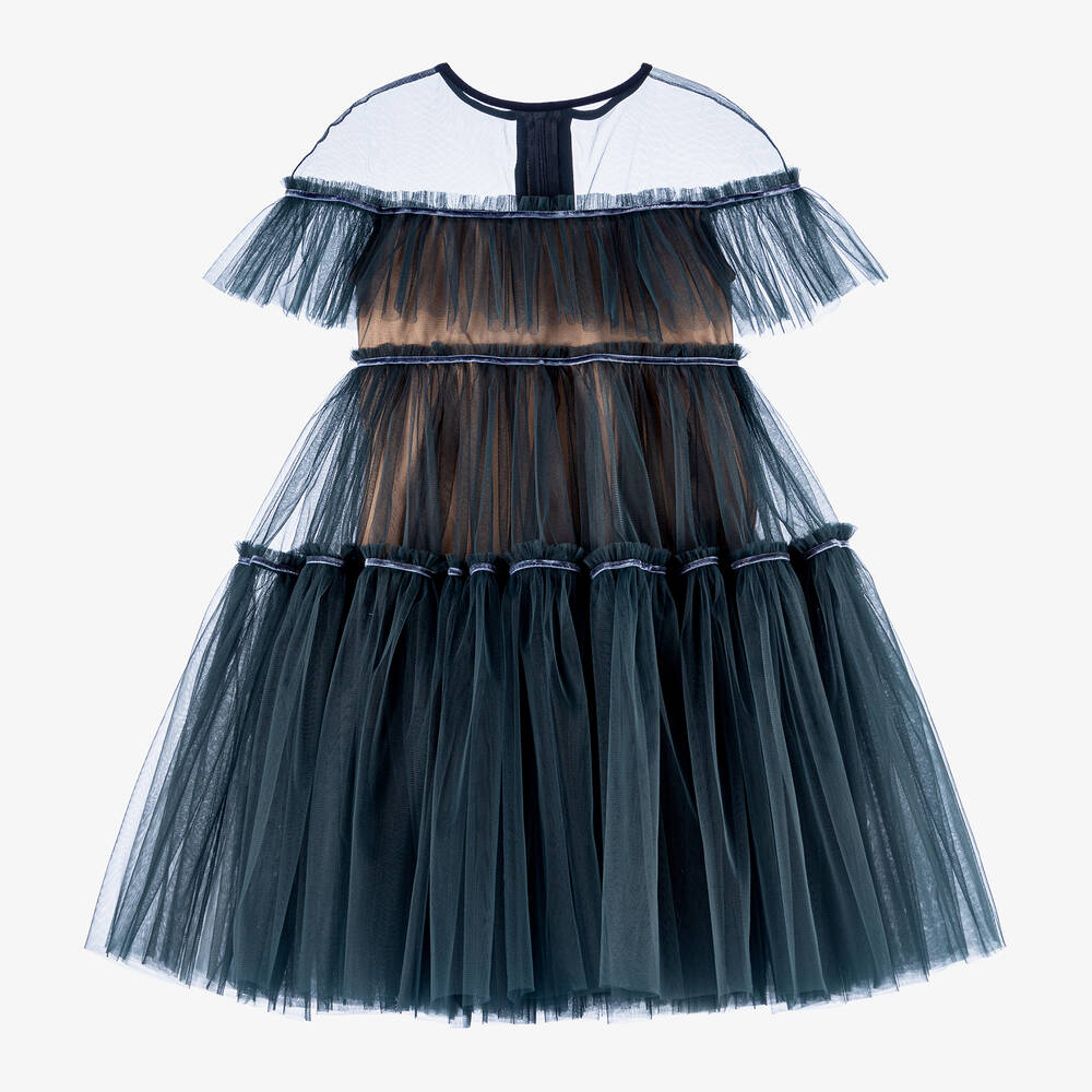 Dark midnight blue dress for girls by RaspberryPlum, made in soft tulle. Beautiful for a special occasion, the tiered layers of tulle give this trapeze-shaped dress a dramatic, voluminous look. There is a sheer panel over the shoulders and delicate velvet trims for a glamorous feminine finish. Fully lined for comfort, it fastens neatly on the back with a zip.