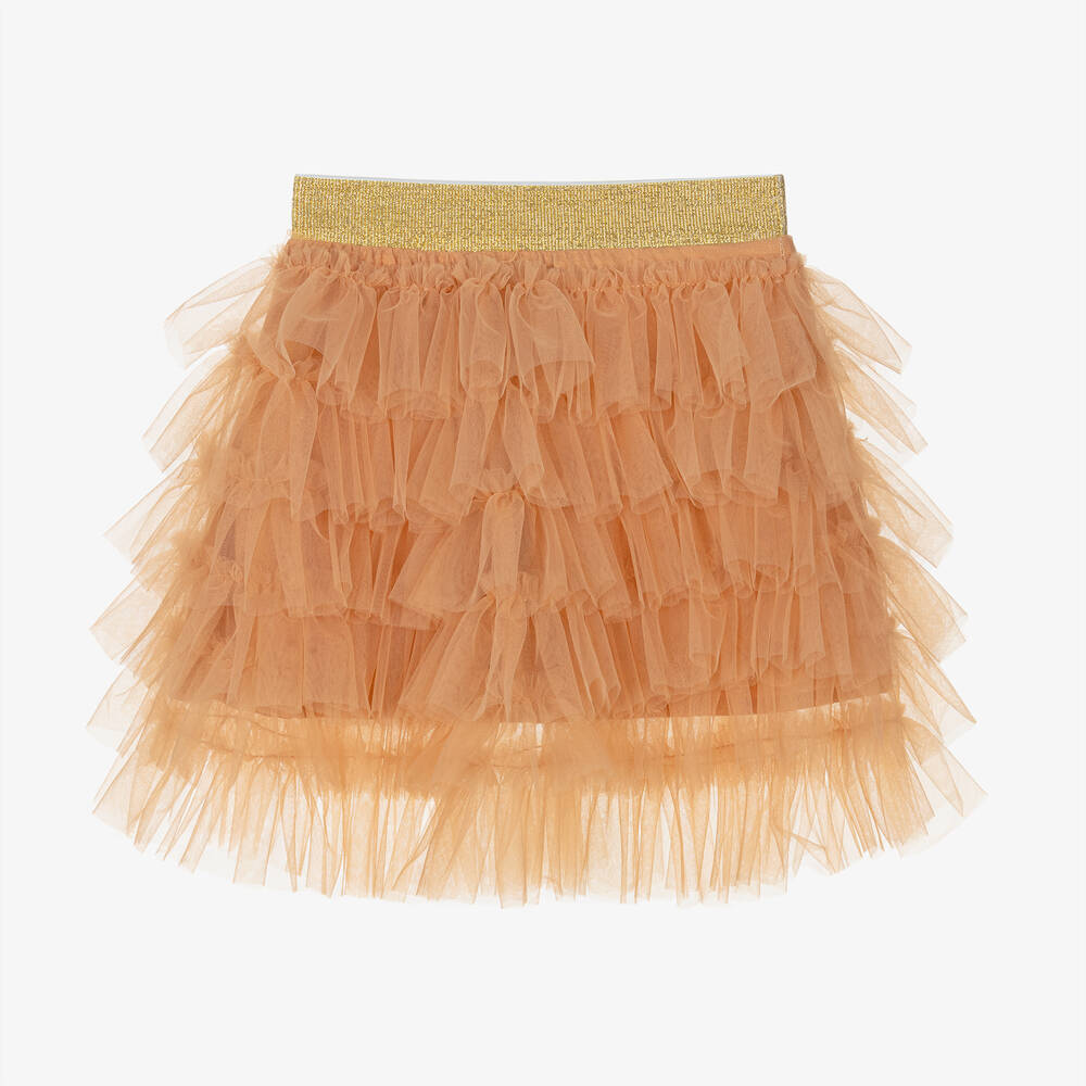 Pretty pastel orange skirt for girls by RaspberryPlum, made in soft fine tulle. For a stunning look, the tulle is arranged in gathered tiers and the stretchy waistband is woven with shiny gold thread, ideal for parties. A soft viscose lining ensures comfort.