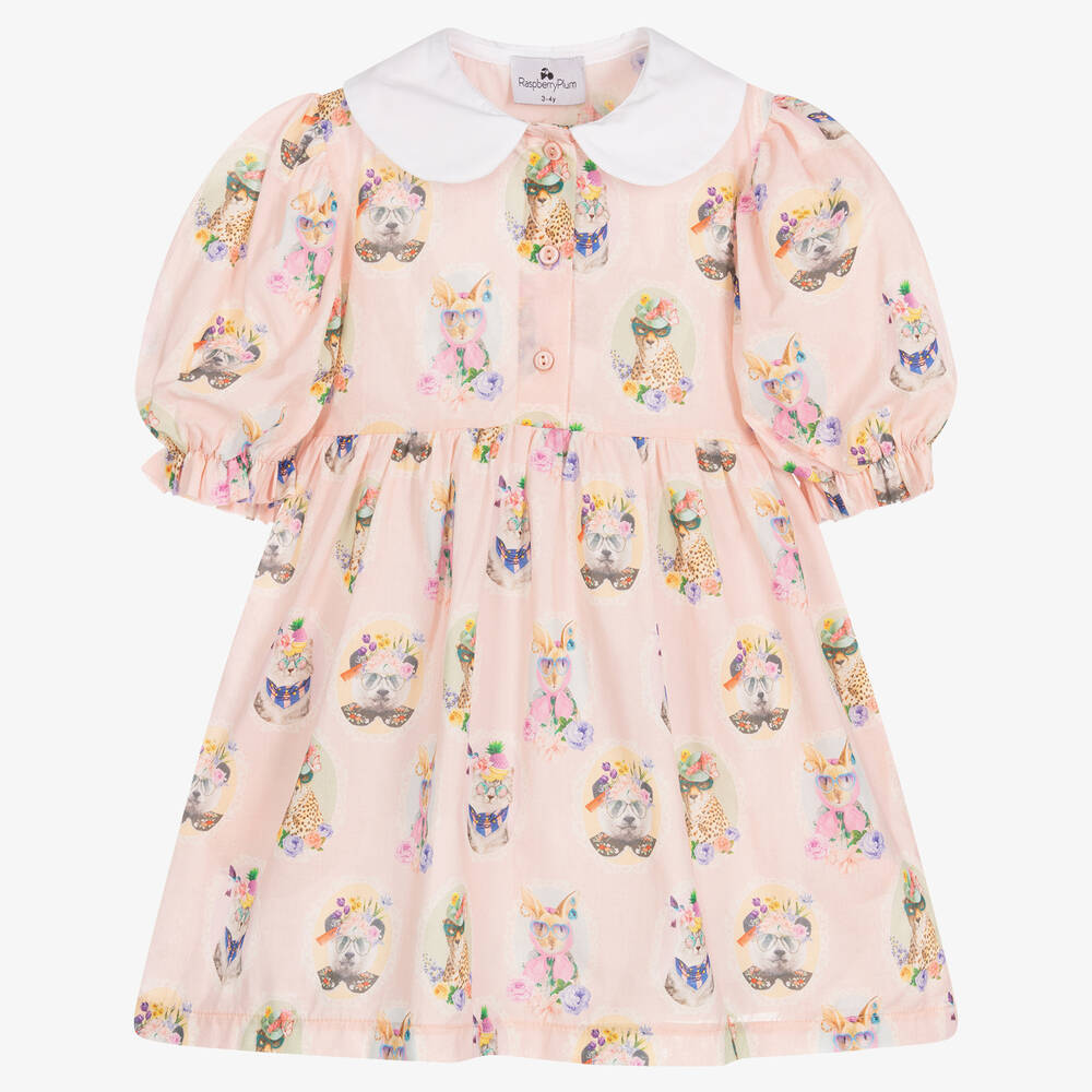 Girls pink animal print dress by London-based designer, RaspberryPlum. Made in soft cotton voile, the lightweight fabric has a fun and quirky cameo animal design, with puff short sleeves and front button fastenings. There is an oversized collar, side seam pockets and an A-line-shaped full skirt that secures with ties on the back.