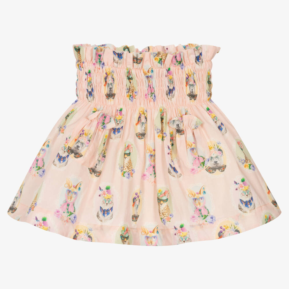 Girls pink cotton skirt by London-based designer, RaspberryPlum. Soft and lightweight, the fabric has a quirky animal cameo print and cute patch pockets on the front. There is a stretchy ruched waistband with ruffle trim and it is fully lined for comfort.