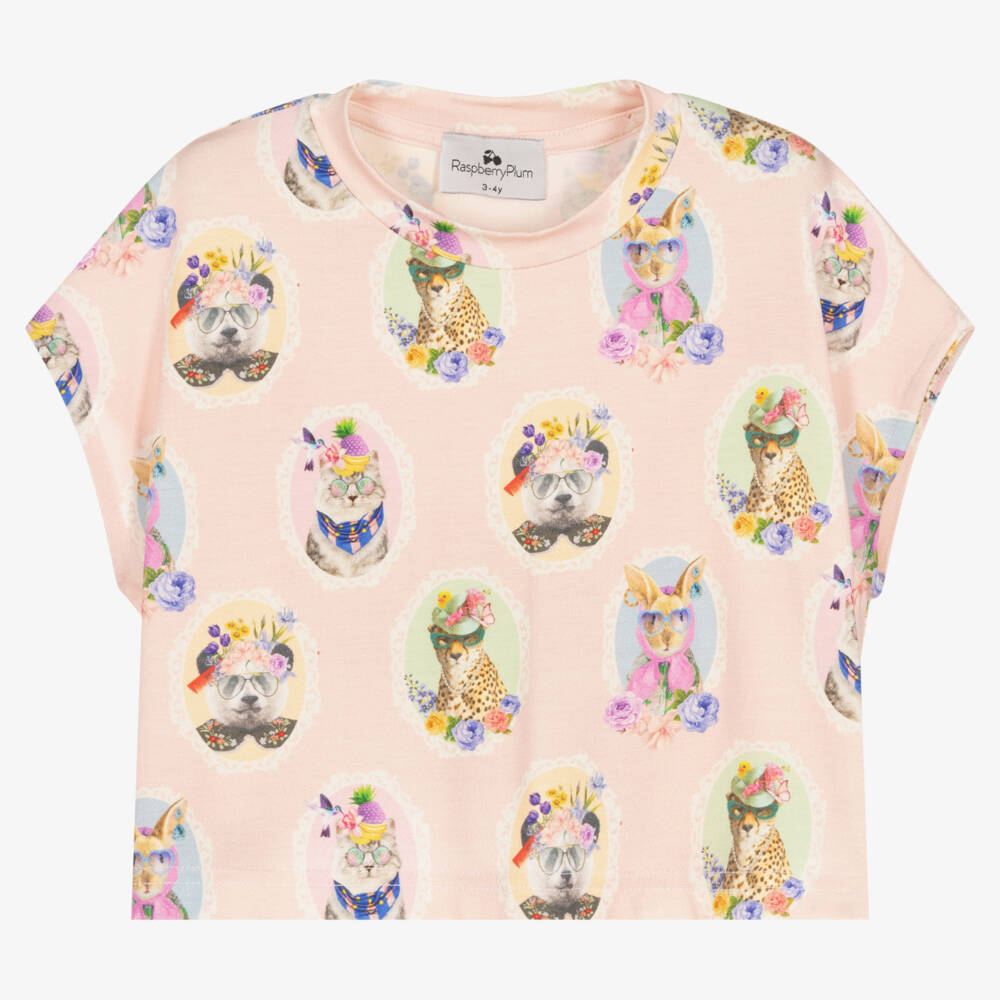 Girls pink viscose jersey top by London-based designer, RaspberryPlum. Soft and lightweight, the fabric has a quirky animal cameo print and cute and a wide, oversized fit.