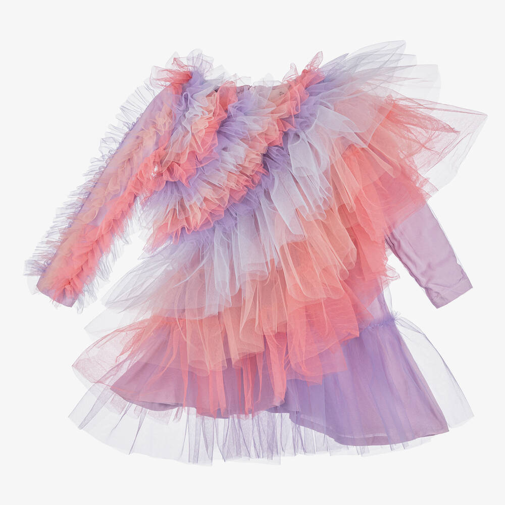A gorgeous tulle dress for girls by British brand RaspberryPlum, in complementary hues of pink, lilac purple and blue. This stand-out design has a round neckline and long sleeves for more coverage. The curved tulle layers and ruffled trims create a fuller silhouette and give the design a unique, asymmetric shape. The dress has a soft viscose lining for added comfort and fastens with a concealed zip on the back.