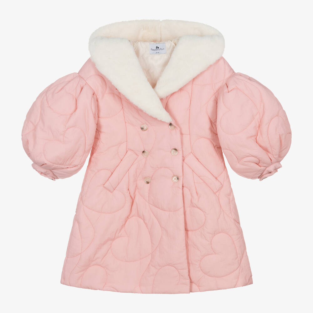 A gorgeous pink quilted coat for girls by RaspberryPlum, made in crinkled satin. Designed for a stand-out look, this double-breasted style has a shawl collar and attached hood with beautiful ivory faux fur trim. It is designed with dropped shoulder, dramatic puffed sleeves and has mock horn button fastenings on the front and cuffs. The coat is lightly padded for warmth and has slanted front pockets to keep hands warm.