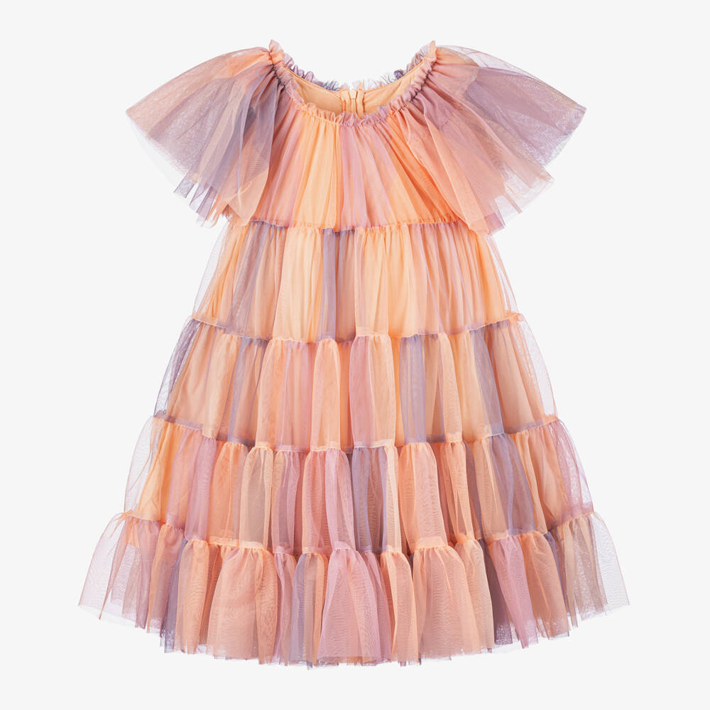 In pretty ombré shades of pink and lilac purple, this floaty tulle dress for girls is by RaspberryPlum. Falling in gathered tiers from the ruffle-trimmed neckline, it has a feminine silhouette and delicate flutter short sleeves. This beautiful occasion style is lined in soft and lightweight viscose for comfort and fastens with a neat, concealed zip on the back.