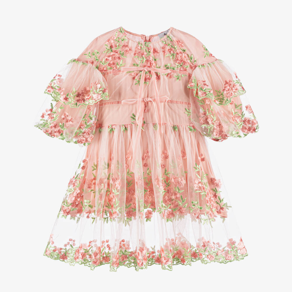 A charming pale pink dress for girls by RaspberryPlum, made in embroidered tulle with a soft viscose lining for comfort. It fastens with a concealed zip on the back with velvet ties which bow for a pretty finish.