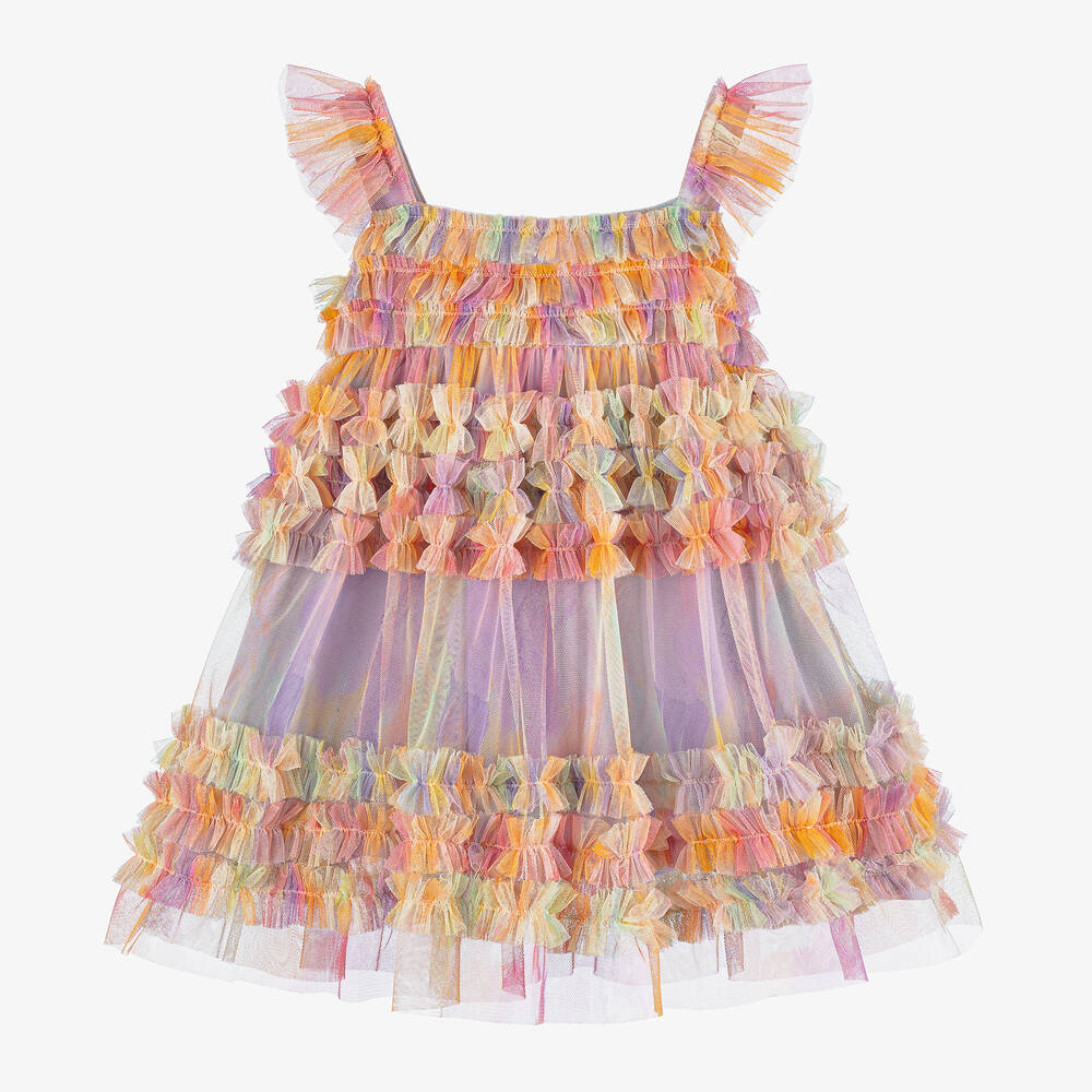 Rainbow-coloured dress for girls by RaspberryPlum, in oranges, pinks, greens and purples. Beautiful tulle ruffles cascade to the hem in a fun tie-dye effect, a truly stunning look from the British designer. This sleeveless dress has flounce frills on the shoulder straps, a square neckline, and a comfortable viscose lining in a pretty lilac purple hue. The hidden side zip provides a neat finish and buttons secure the adjustable straps for the best fit.