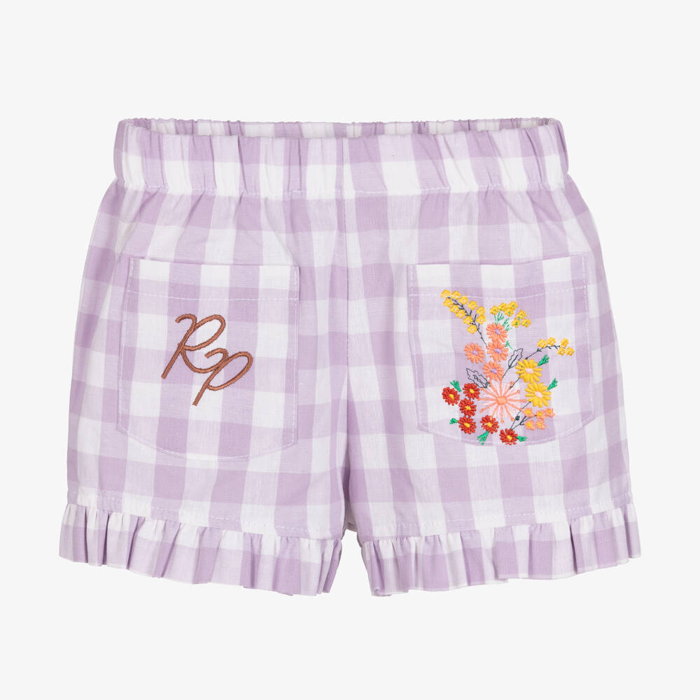Purple and white check shorts for girls by London-based designer, RaspberryPlum. Soft and lightweight, the cotton fabric has a large gingham pattern and two front patch pockets with RP logo and floral embroidery. There are frilled trims and an elasticated waistband for comfort and fit.