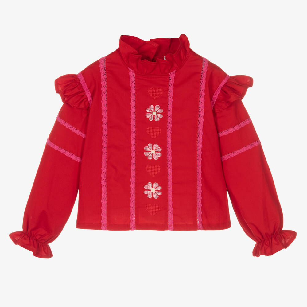 By London-based designer RaspberryPlum, a gorgeous burgundy red blouse for girls with bright neon pink cotton lace details. With a 60's flower power cross-stitched heart and floral motif on the front, it has a Victorian style high-neck, and accentuated puffed sleeves.