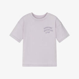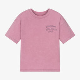 Pink, organic cotton T-shirt for boys and girls by Roarsome, made in soft slub jersey with a cool washed effect. An oversized, drop-shoulder fit, this casual tee features the brand's Hop the Bunny print on the back and 'Roarsome adventure club' on the front.