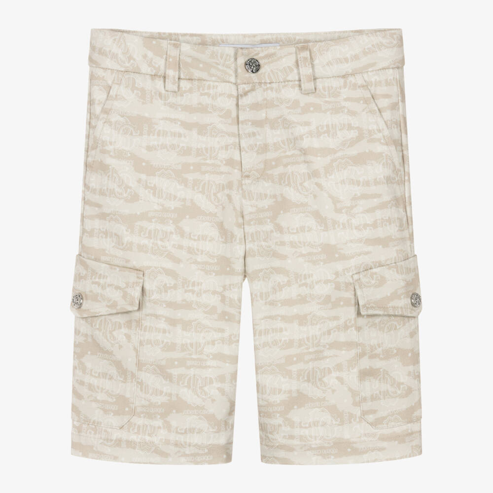 Stylish beige cotton shorts for boys by luxury Italian label, Roberto Cavalli, with monogram and tonal animal prints. For a cool twist on the classic Bermuda shorts, they have cargo pockets with branded silver poppers.