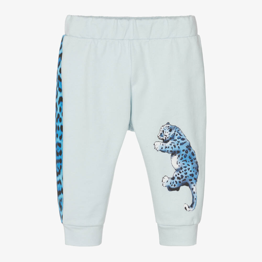 Pale blue joggers for little boys by luxury designer Roberto Cavalli, made in mid-weight cotton jersey with an elasticated waistband. Synonymous with the Italian brand, these mid-weight trousers are characterised by a blue jaguar motif on the leg and an RC Monogram print on the back. There is a bold leopard print trim on one leg in a contrasting shade of blue.