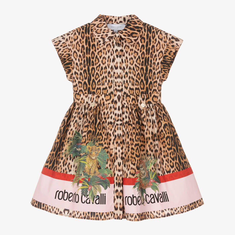 A dark beige leopard print shirt dress for girls by luxury Italian brand Roberto Cavalli, made in lightweight cotton poplin. Bold and eye-catching, the designer's logo is printed in a pink and red stripe alongside jungle animals. It has a pointed collar, a concealed button-up placket and gold-tone popper belt loops embossed with the signature RC monogram. This short-sleeved dress is comfortably lined in soft cotton with tulle netting trim for added volume.