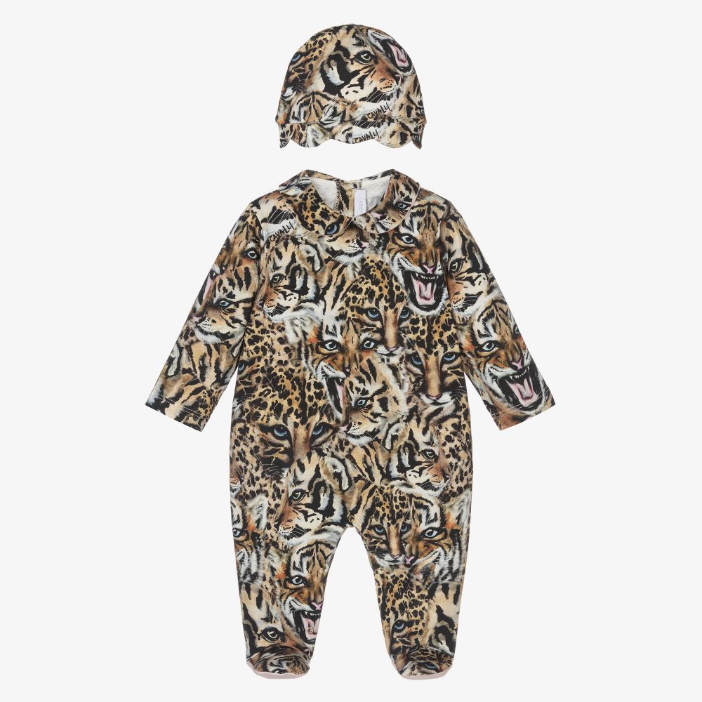 Babygrow and hat set for girls by luxury designer Roberto Cavalli, made in soft cotton jersey. Both pieces are patterned in a gorgeous black and beige print of leopards and tigers. The babygrow has pale pink trim on the feet, and the hat has a sweet scalloped brim with a pink cotton lining.