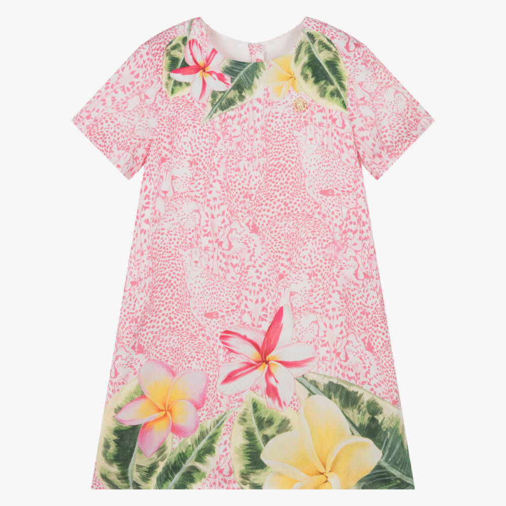 Gorgeous pink and white cheetah print dress for girls by luxury Italian brand Roberto Cavalli, made in silky, lightweight viscose. Simply styled with an A-line shape, the striking animal print is enhanced by colourful tropical lowers printed around the hem and neckline. Fully lined for comfort, it features a gold metal logo on the chest and a concealed zip fastening on the back with a branded pull.