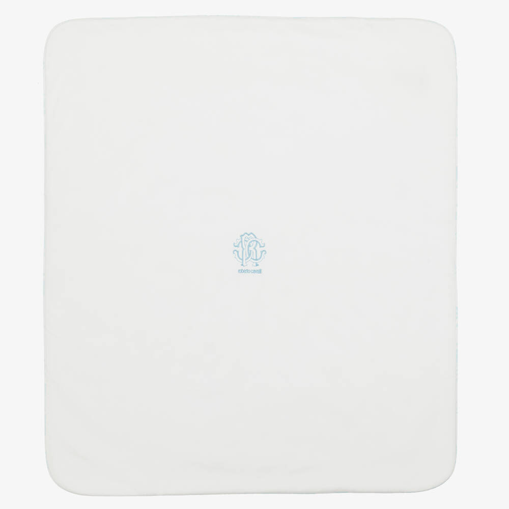 Ivory blanket for baby boys by luxury Italian brand Roberto Cavalli, made in beautifully soft cotton jersey. For instant designer appeal, one side is patterned with the iconic RC Monogram in blue, whilst the reverse is centred by matching logo embroidery. Lightly padded, this cosy and warm accessory makes a stylish addition to any nursery.