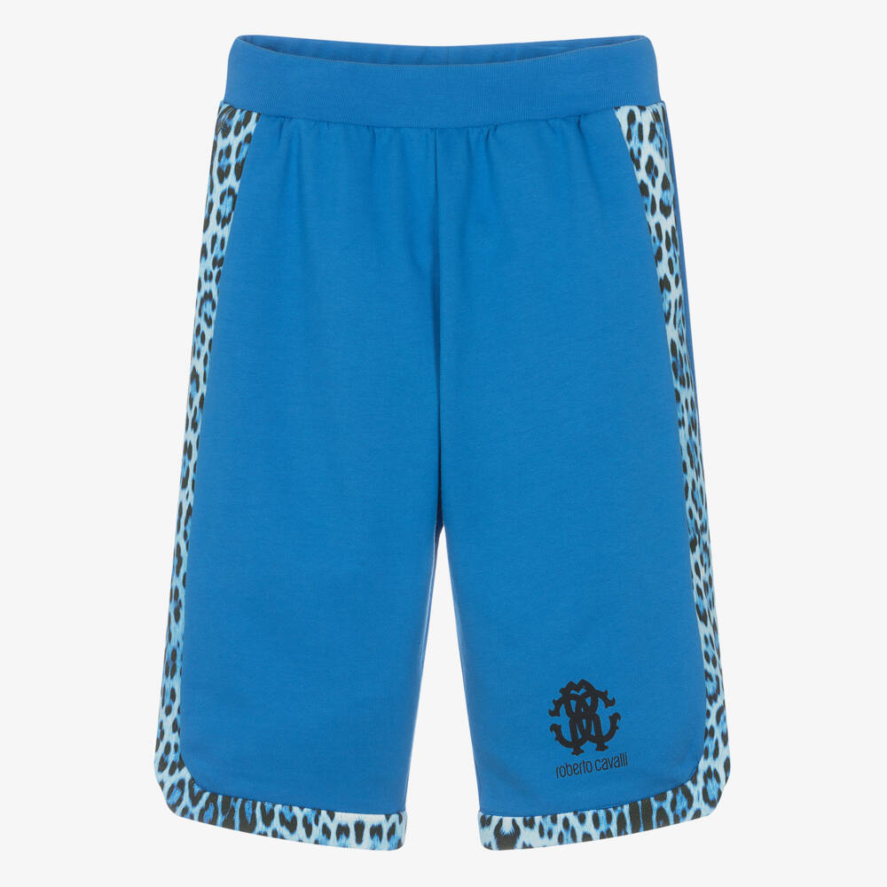 These blue shorts for teen boys by Roberto Cavalli are designed in a laid-back longer-length fit. Renowned for their statement animal print graphics, the luxury brand has styled these striking shorts with bold jaguar-print panels. Enhancing the design is the black RC Monogram print above the hem, adding extra designer appeal. They are made in soft, stretchy and mid-weight cotton jersey, with an elasticated waistband for comfortable wear.