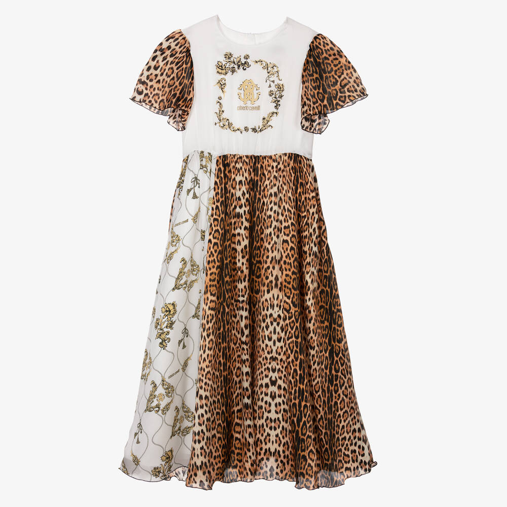 Teen girls luxury silk dress from Italian designer Roberto Cavalli, in contrasting ivory and beige patterns. Stylish and elegant, the brand's RC Monogram is printed amongst leopard print and Arabesque designs for an instantly recognisable look. Fully lined, this dress is styled in a maxi length with delicate short sleeves, fastening effortlessly with a concealed gold-tone zip.