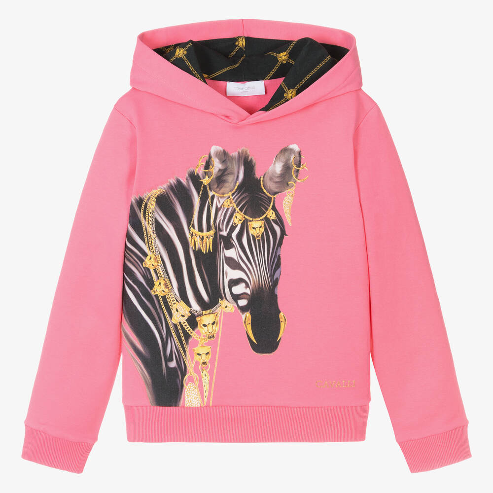 Pink hooded top for teen girls by Roberto Cavalli, made in soft, mid-weight cotton sweatshirt jersey. The front is printed with a black and white zebra wearing striking gold jewellery. There is a gold studded logo near the hem. The fixed hood is lined in a contrasting black and gold jewellery print jersey.