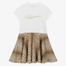 This white cotton babysuit set for girls by Roberto Cavalli captures the brand's signature style with its distinctive leopard print trims and embroidered script logo in glittery gold. Made in soft comfortable jersey, the babygrow fastens with poppers, whilst the bib is lined for extra absorbency. The layette hat has a sweet turned-up brim.