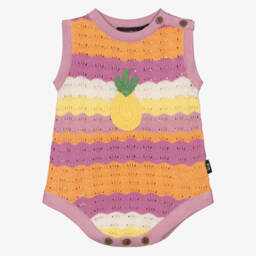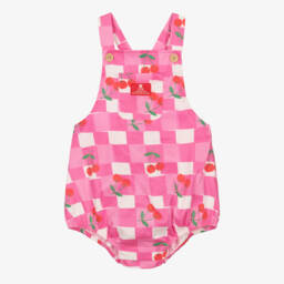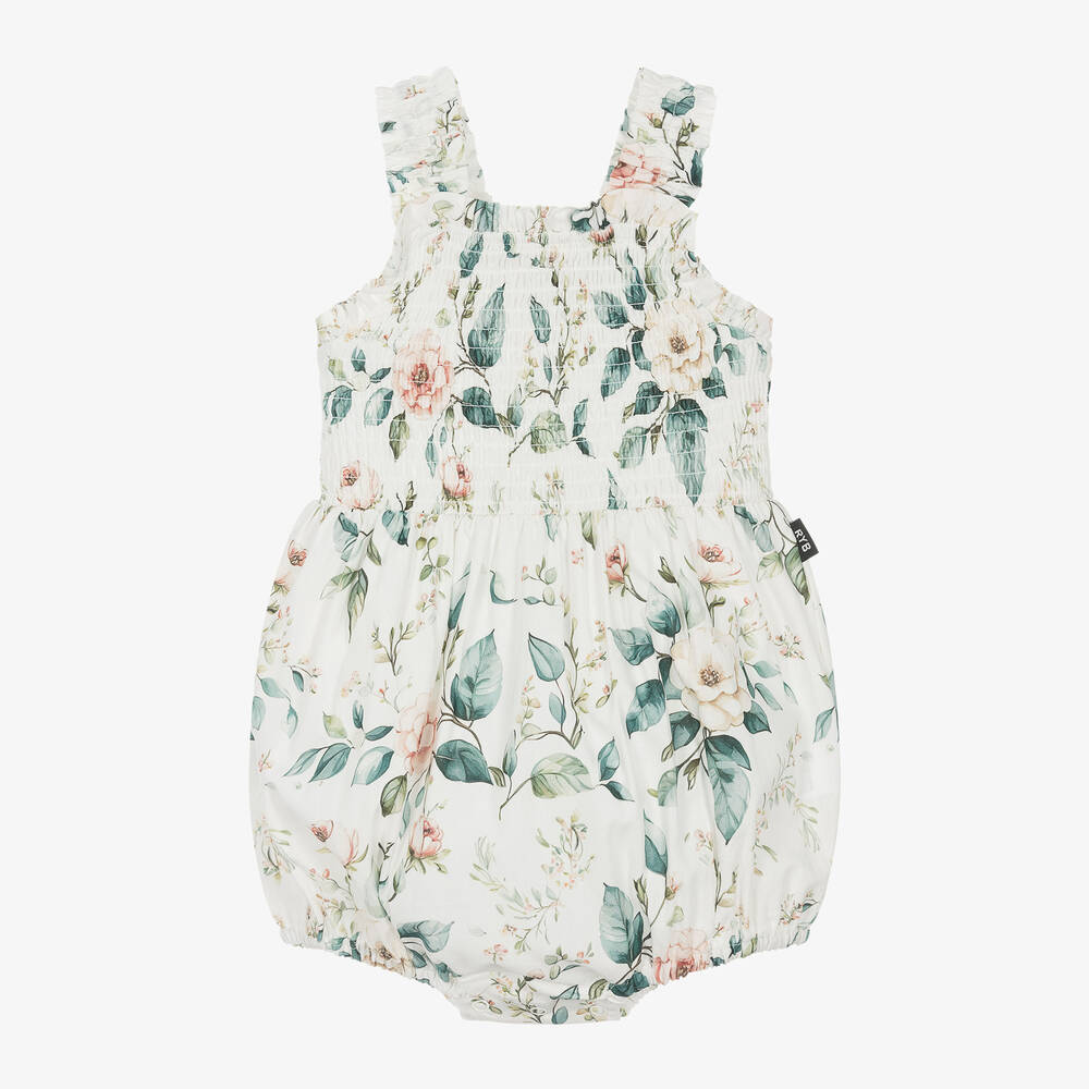 A charming pale ivory cotton shortie for baby girls from Rock Your Baby, with a pink, beige and green floral pattern. Lovely for warmer days, this lightweight one-piece is comfortably styled with a shirred bodice and shoulder straps. It has pretty frilled trims and gently elasticated cuffs, with popper fastenings between the legs to help with dressing.