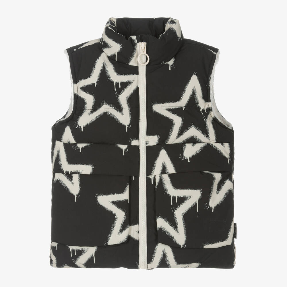 Black gilet for boys and girls by Rock Your Baby. Silky smooth, it has an ivory, graffiti inspired star design with dripping paint effects. Warmly padded with a cosy sherpa fleece lining, it has useful patch pockets on the front and an ivory zip fastening. There is a branded tab on one side seam and a yellow felted logo on the back for added designer appeal.