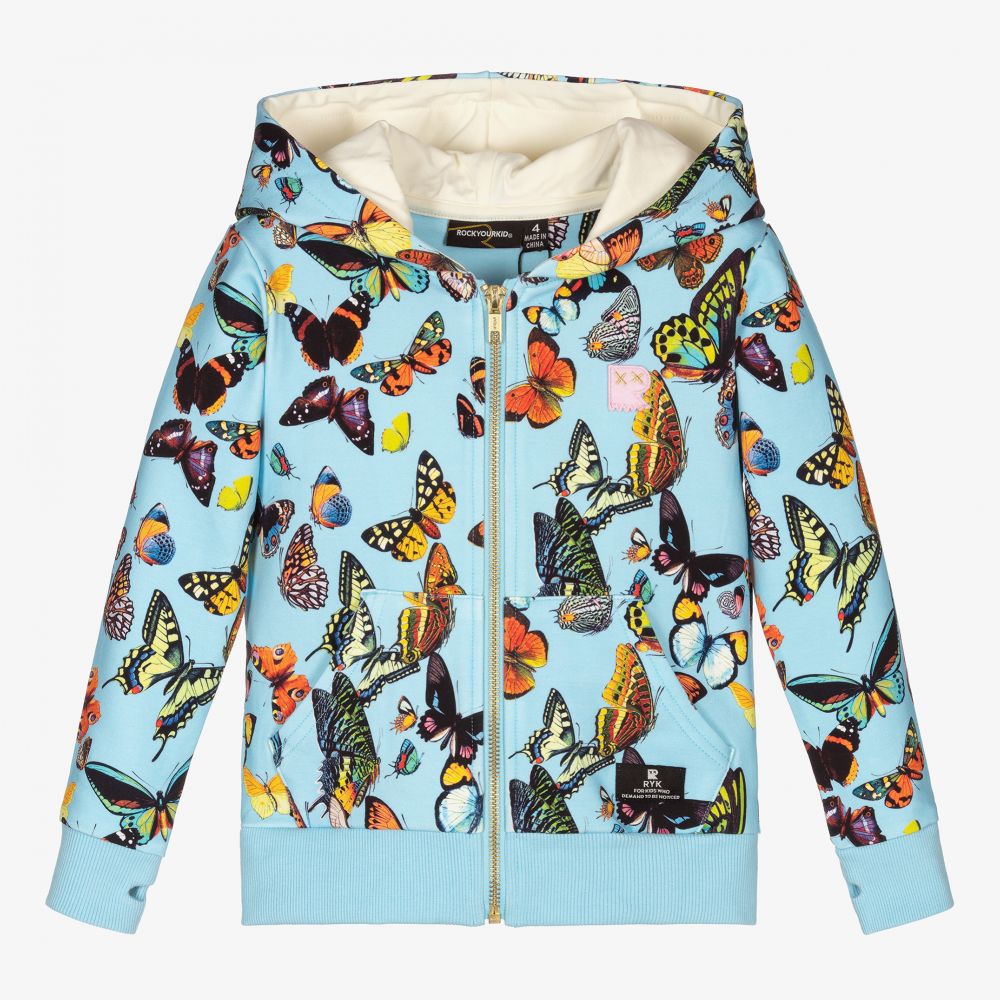 Blue hooded zip-up for girls by Rock Your Baby, patterned with colourful butterflies. Made in soft cotton jersey, it has ribbed trims and front pouch pockets. There is an exposed gold zip fastening on the front.