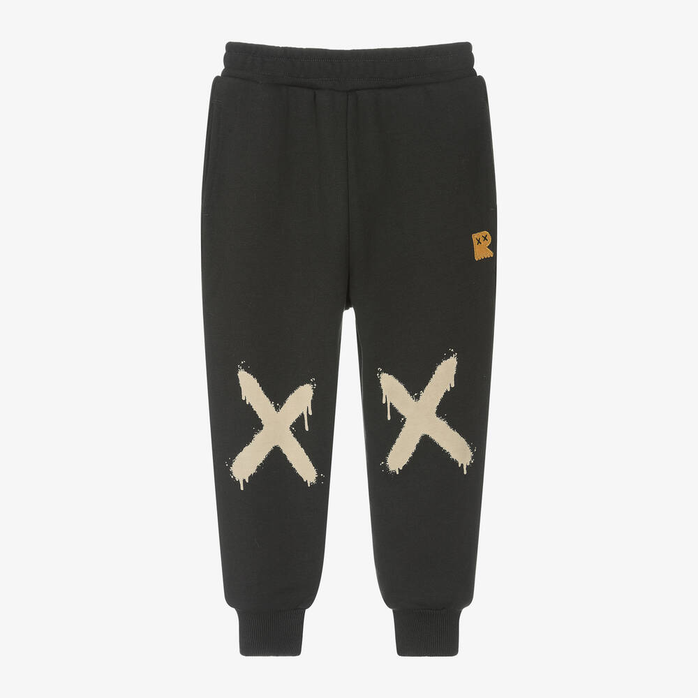 Black joggers for boys by Rock Your Baby, made in soft, mid-weight cotton jersey, with a washed look. They have a cool, ivory graffiti inspired 'X' on each leg with a dripping paint effect. Casual and comfortable to wear, they have side seam pockets, cosy ribbed trims and the brand's orange and black felted logo on one leg for a branded finish.