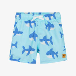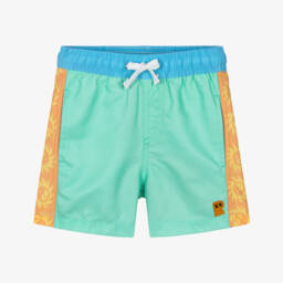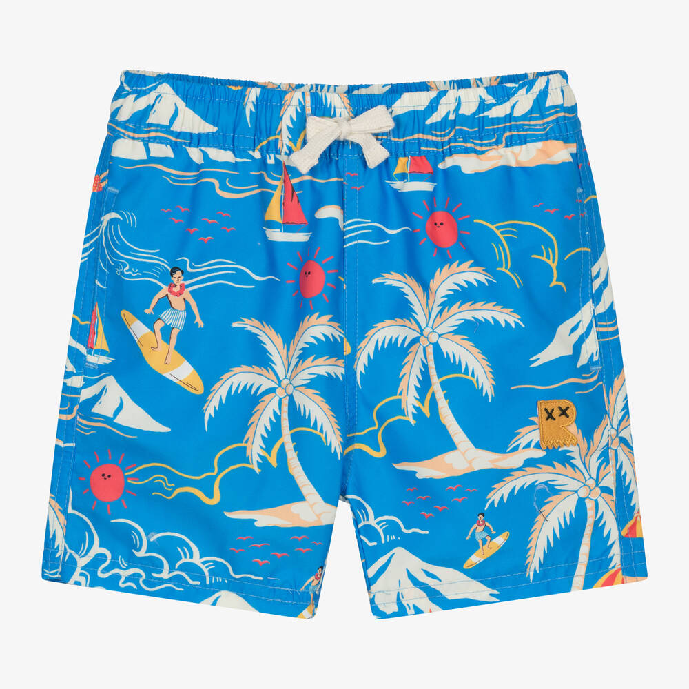 From Australian brand Rock Your Baby, bright blue swim shorts for boys patterned with a tropical surfing scene. With a comfortable mesh lining, these silky smooth shorts have an elasticated waist that can be secured with a drawstring. This item contains recycled fibres.