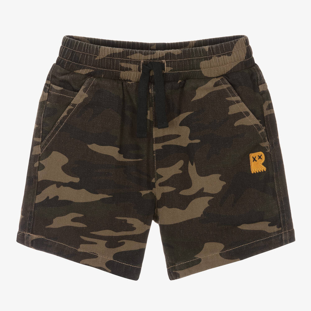 Casual Rock Your Baby camouflage shorts for boys in muted khaki green, brown and black shades. Garment-washed for a vintage look, they are made in durable cotton twill with a elasticated waist and adjustable drawstring tie. Designed with five useful pockets, they have logo appliqués on the front and back for a subtle designer finish.