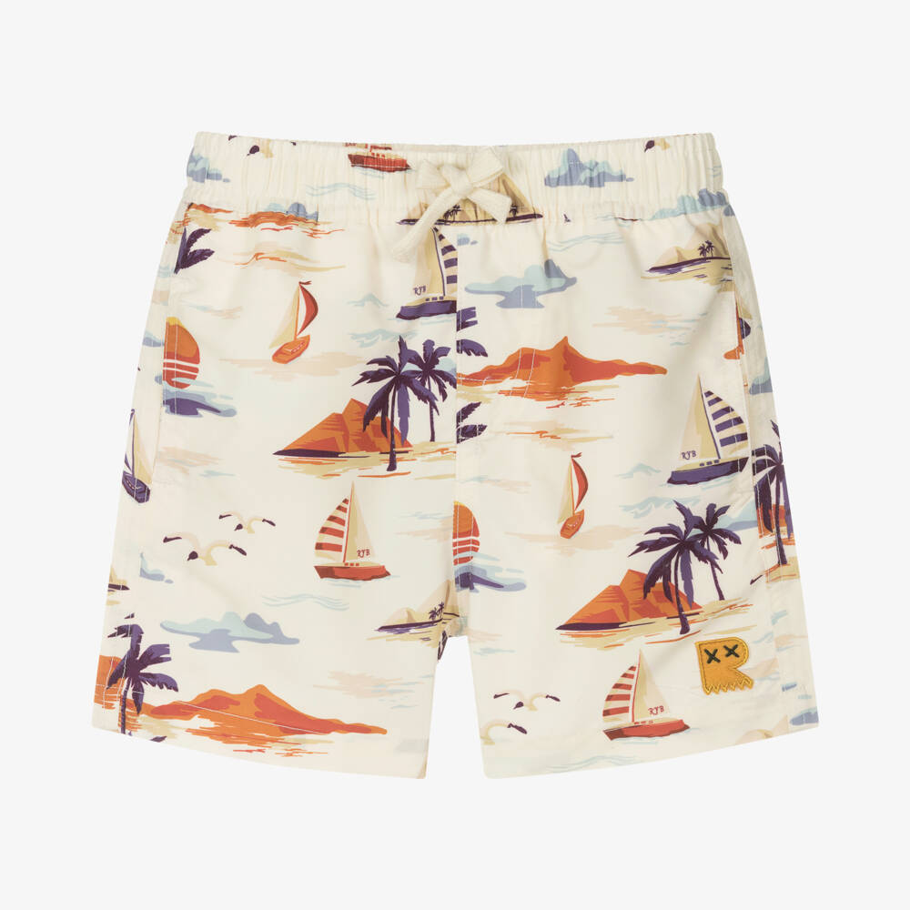 Ivory swim shorts for boys by Rock Your Baby, patterned in a lovely desert island print. These silky smooth shorts are lined in soft mesh for comfort and have an elasticated drawstring waist. They have side seam pockets and a useful velcro fastening pocket on the back, with logo patches adding an extra designer touch. This item contains recycled fibres.