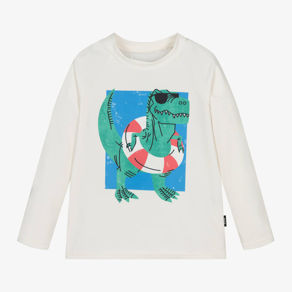 A sun-protective ivory swim top for boys by Australian brand Rock Your Baby. Made in stretchy silky fabric with UPF 50+, it has a high neckline and long sleeves for good coverage in the sun. The front is printed with a large dinosaur in a rubber ring for a fun look. Parts of this garment are made from recycled fabrics.