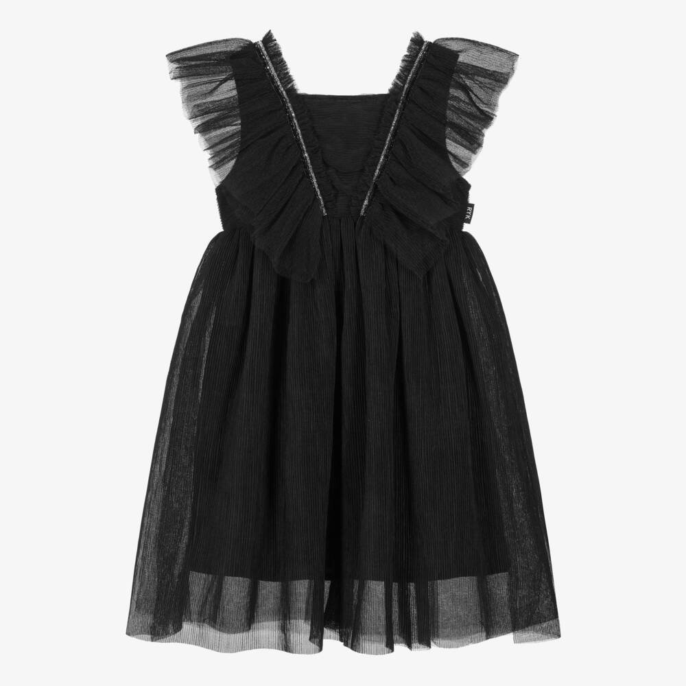 This gorgeous black dress for girls by Rock Your Baby, is made in finely pleated tulle. Lovely for parties, it combines playful style with elegant design. The bodice features gathered ruffles, embellished with glittery ribbon and the voluminous skirt is ideal for girls who love to twirl. Lined for comfort, the dress fastens on the back with a concealed zip.