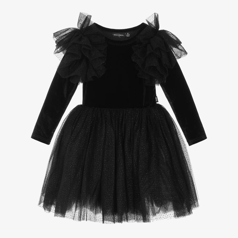 Gorgeous for a party, this stunning black dress for girls is by Rock Your Baby. The fitted bodice is made in soft velour with a lustrous sheen, and the voluminous skirt sparkles beautifully in layers of glittery soft tulle. Exaggerated tulle ruffles on the shoulders add extra dramatic effect. Stretchy and comfortable to wear, the dress simply slips on over the head.