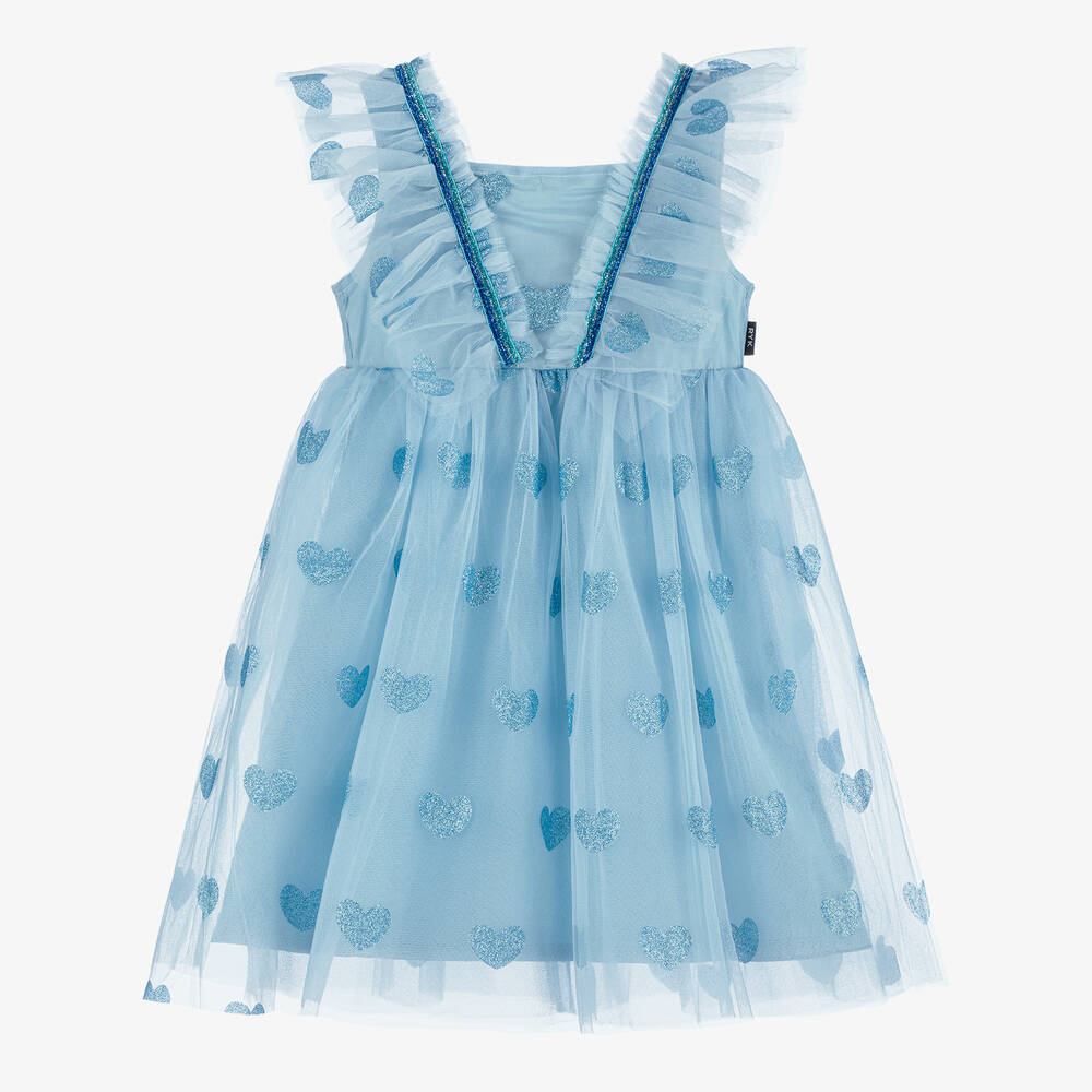 A wonderful pale blue party dress for girls by Australian brand Rock Your Baby, made in layers of lightweight tulle with a full, gathered skirt. It sparkles with a glittery blue heart print and contrasting blue tape on the pleated ruffles over the shoulders. The dress is fully lined in cotton for comfort and fastens with a concealed zip on the back.