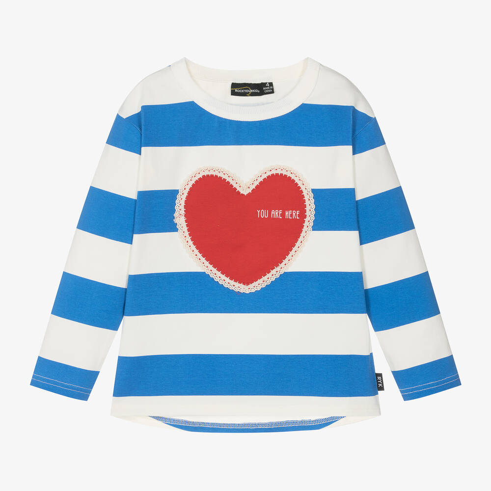 Blue and ivory striped top for girls by Australian brand Rock Your Baby, made in soft cotton jersey. It has a large red heart appliqué on the front trimmed with ivory lace and with the words 'You Are Here' printed on one side. A fun, casual piece, this long-sleeved top has a ribbed crew neck and a stylish dipped hem at the back.