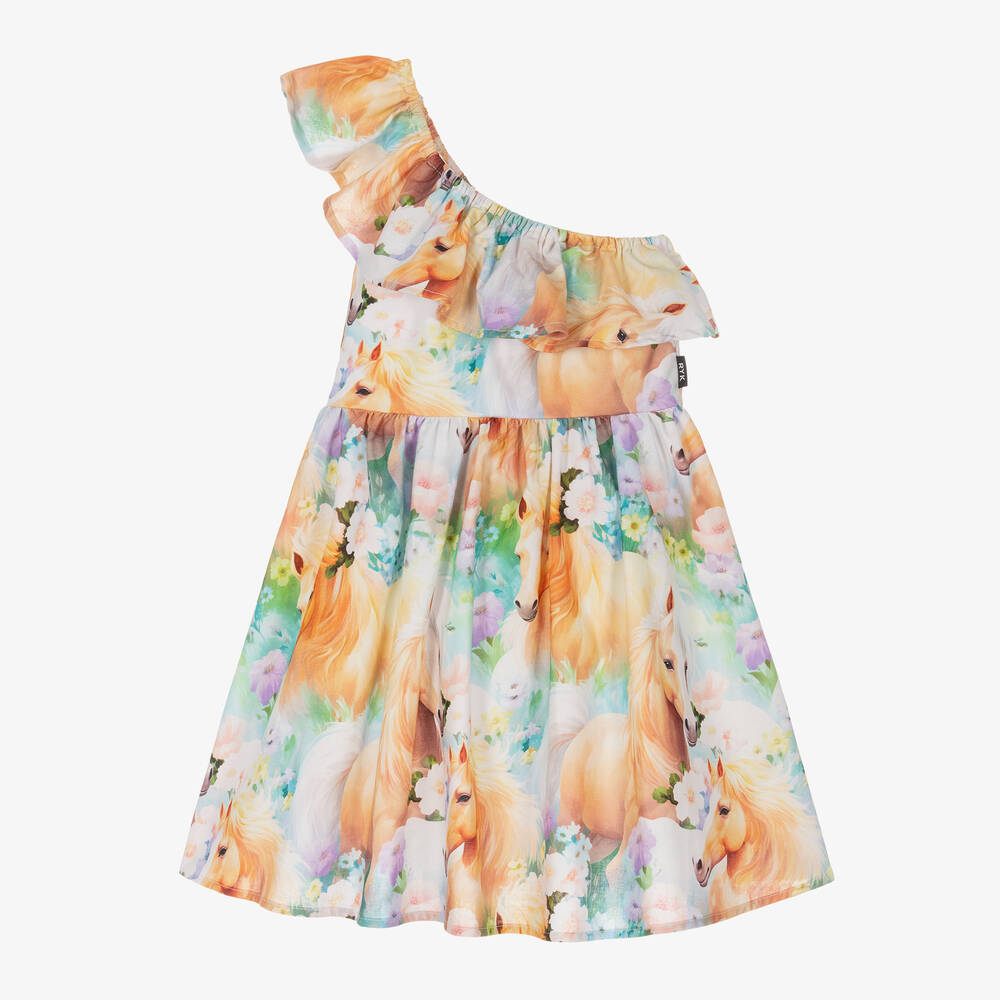 Girls blue dress by Rock Your Baby, softly woven in lightweight cotton. Patterned with cute horses and pretty pastel flowers, this asymmetric style has a sweeping ruffle across one shoulder and a gathered skirt. It fastens discreetly with a concealed zip on one side of the bodice.