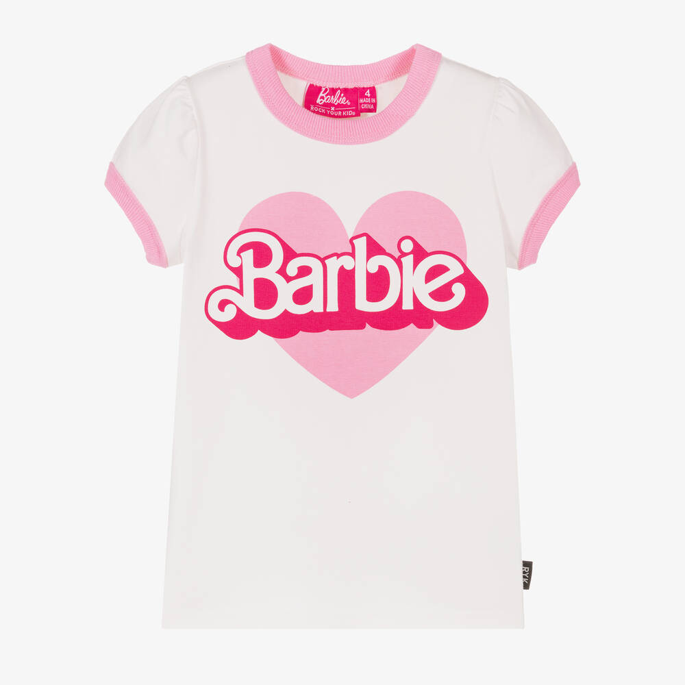 Girls ivory T-shirt by Rock Your Baby, made in soft cotton jersey. It has a bold Barbie heart motif printed on the chest and playful pink piping. The sleeves are puffed for a super cute look.