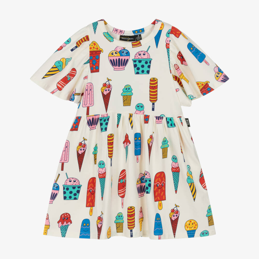 Ideal for warm sunny days, this ivory cotton dress for girls is by Rock Your Baby, and a delightful addition to any wardrobe. Made in soft, comfortable jersey, it has a fun, vibrant ice cream print, with pretty angel sleeves and a full, gathered skirt. With useful, concealed pockets on the side seams, the dress has an easy pull-on style.