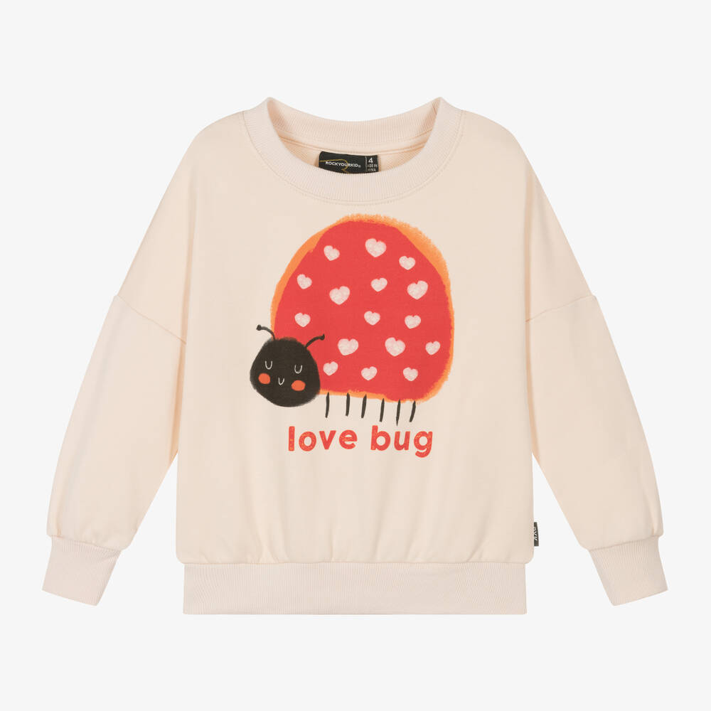 Girls fun ivory cotton sweatshirt by Rock Your Baby, with a large red ladybird printed on the front. Super comfortable, it has a relaxed, drop-shouldered fit, with cosy ribbed cuffs and is made in soft, stretchy jersey.