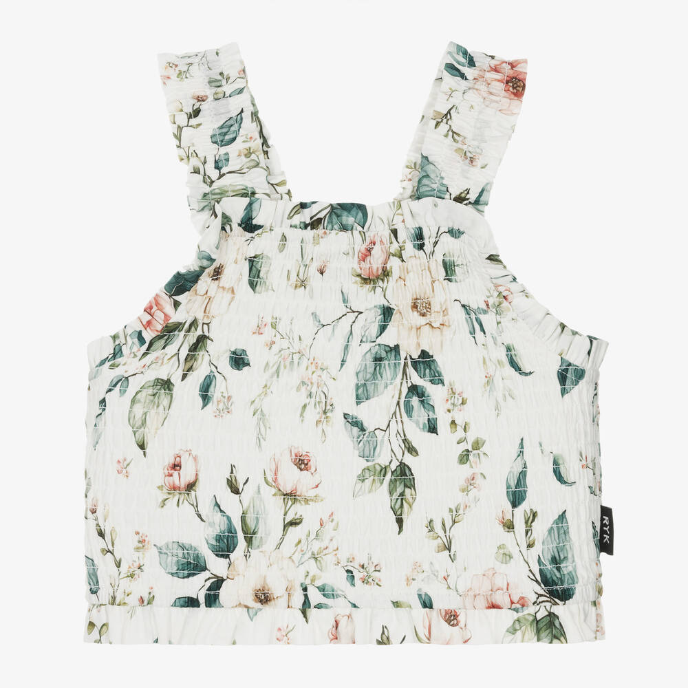 Pale ivory sleeveless top for girls by Rock Your Baby, made in soft, lightweight cotton. In a comfortable, shirred design with stretchy shoulder straps, this lovely top has a gorgeous pink, beige and green floral pattern and pretty frilled trims.